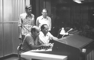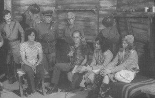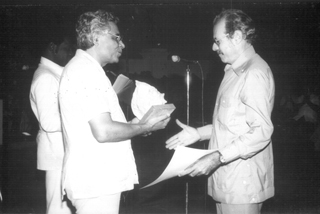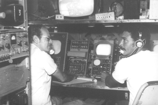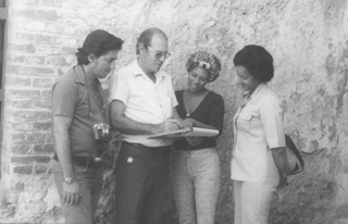 En la primera foto Amado Cabezas Sanz, con el equipo de dirección de la serie "La máscara roja", en la segunda con Erick Kaupp, en la tercera recibiendo de manos de Jose Massip el premio Caracol a la mejor adaptación por el serial "El Halcón". En la cuarta con Julio el fotografo, Carmen Alvarez actriz, y Magdalena Pozo asesora, durante el rodaje de la serie "Robin Hood" en el Morro de Santiago de Cuba. En la quinta en el interior del remoto con el realizador de imágenes Sierra Gayan.